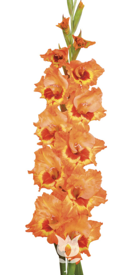 Un gladiolo naranja con manchas amarillas, con una altura de planta de 80-100 cm y un tiempo de crecimiento de 70 a 90 días. Apto para: exterior. Se puede plantar al aire libre para la producción de flores de primavera.